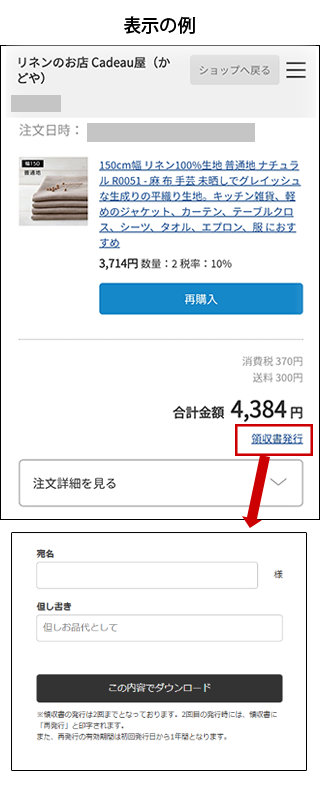 1)マイページ(注文履歴)へログインし、対象の注文を検索します。 2)「領収書発行」をクリックし、領収書の宛名・但し書きを入力します。 ■入力項目 宛名:20文字以内で入力します。 但し書き:「但し」なども含め、200文字以内で入力します。 3)「この内容でダウンロード」をクリックしてPDFでのダウンロードをおこないます。 <ご注意> ・ポイントやクーポンをマイナスした金額での発行になります。 ・初回ダウンロードは、注文日から無期限でいつでも可能です。 ・再発行は、初回ダウンロード日から1年間可能です。 *以下の場合は領収書の発行を行っておりません ・キャンセルされた注文以下の書類は領収書として正式に認められています。合わせてご確認ください。 ・クレジットカードの利用明細書 ・銀行振込の振込明細書、預金通帳 ・コンビニ払いの店頭でもらったレシート