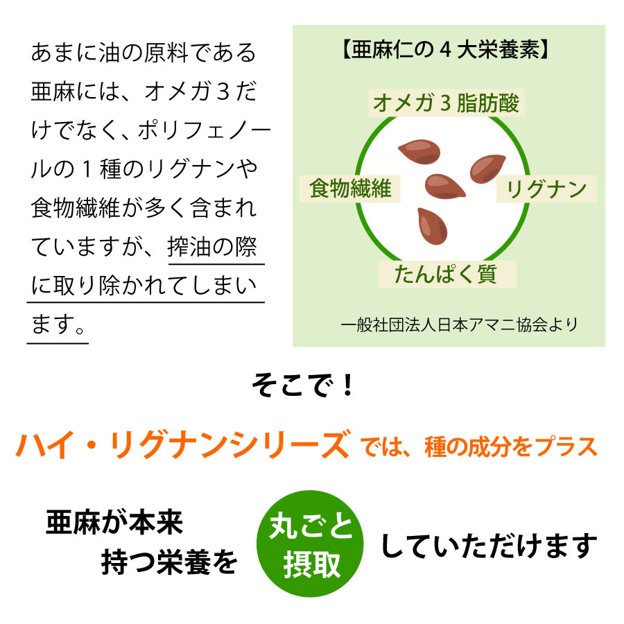 あまに油(亜麻仁油)は、体内でつくることができない必須脂肪酸「α-リノレン酸(オメガ3脂肪酸)」が非常に豊富です。