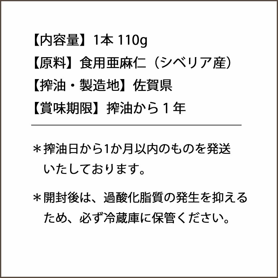 当店の亜麻仁油のレジェンド的存在。生鮮食品としてのこだわりから、搾油日を箱に印字して新鮮さを担保しています。一番搾り油のみをビンに詰めた贅沢な一品です。