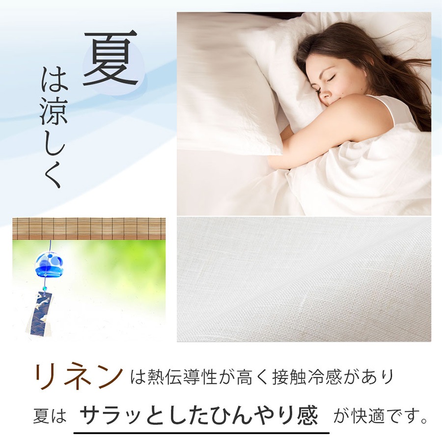 リネンは吸水性、速乾性に優れ、睡眠中に発汗される水分をしっかり吸収し、すぐに外へ放出してくれますので、一晩中さらりとした肌触りが心地よく、朝まで快適にお休み頂けます。
