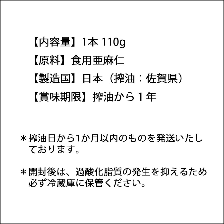 当店の亜麻仁油のレジェンド的存在。生鮮食品としてのこだわりから、搾油日を箱に印字して新鮮さを担保しています。一番搾り油のみをビンに詰めた贅沢な一品です。