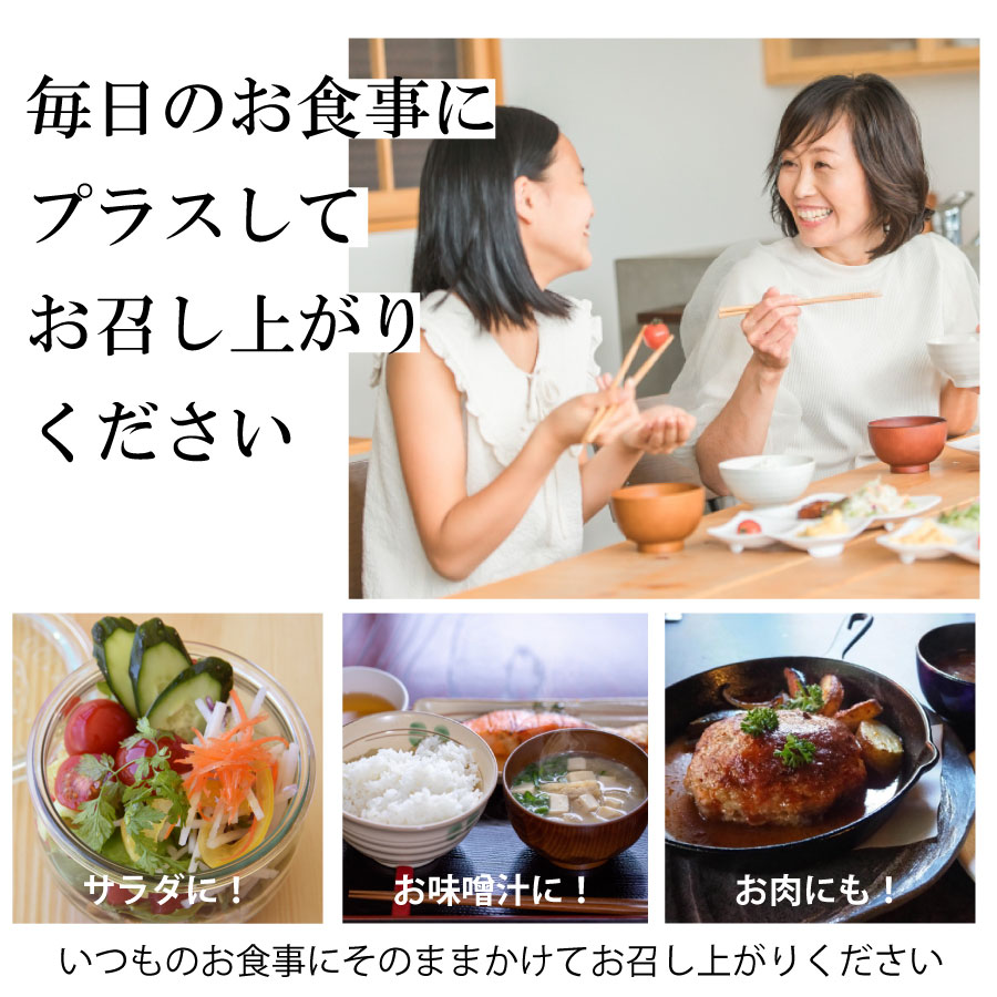 サラダ、ヨーグルト、スムージー、納豆など、いつもの料理にそのままかけるだけで手軽にオメガ3を補給できます。