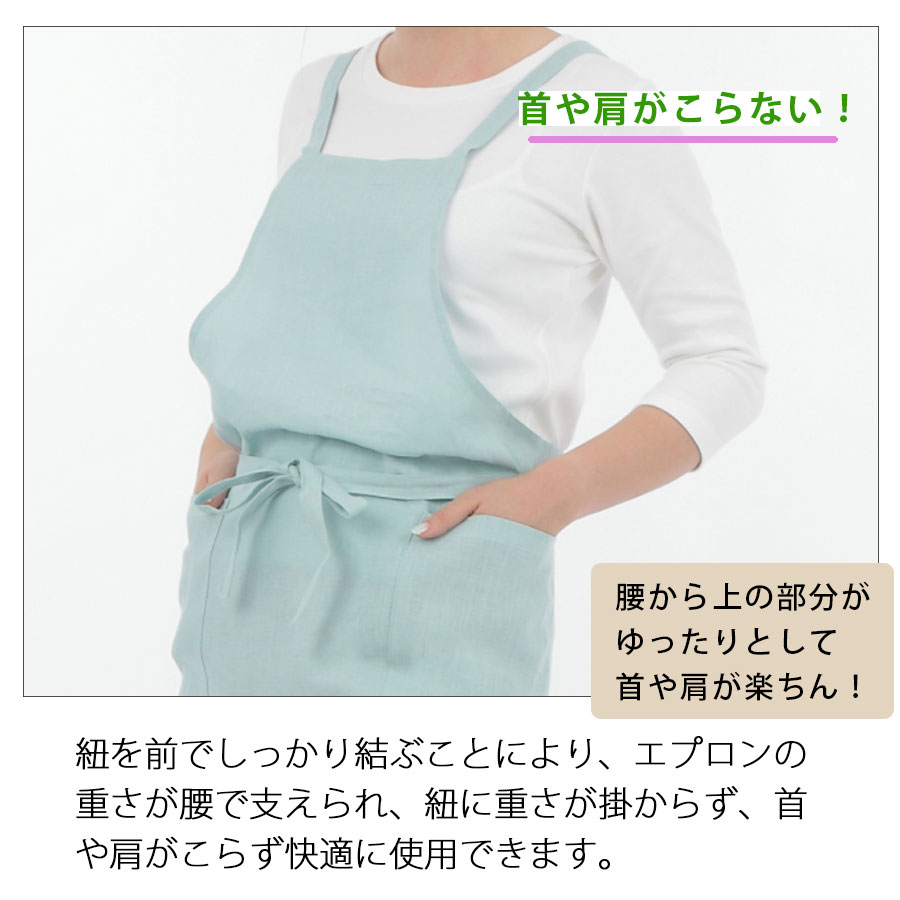 ほどよいハリ感で、肌触りのよいリネン100%のエプロン。リネンならではの光沢感が美しい素材です。