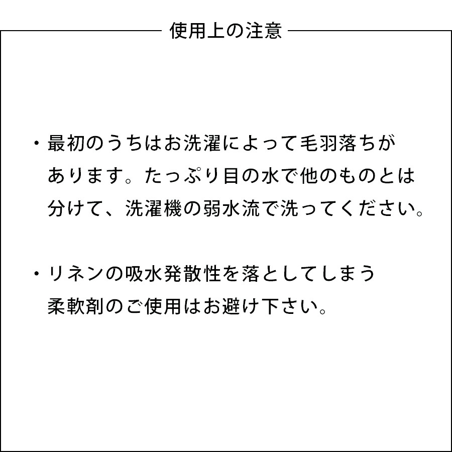 柔軟剤はリネンの高い吸水性が妨げられてしまいますので、ご使用はお避けください。 - 乾燥機は避ける