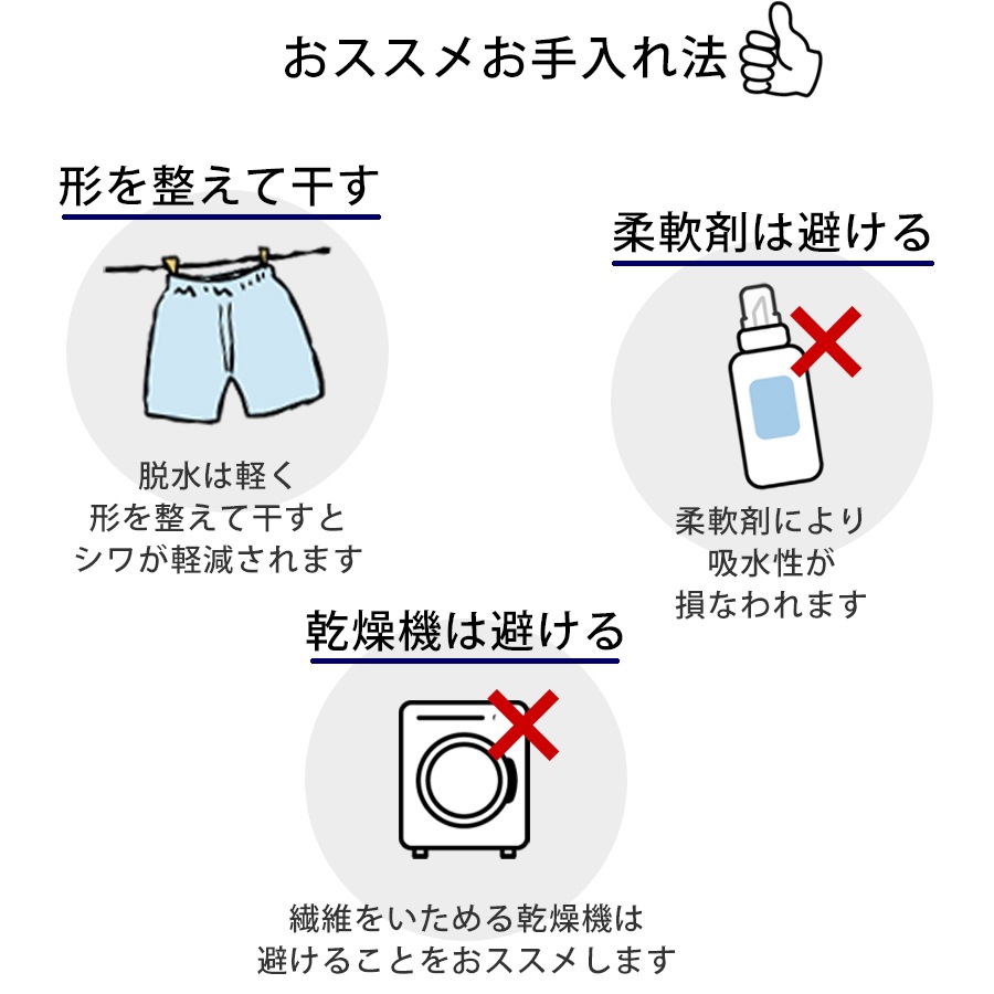 柔軟剤はリネンの高い吸水性が妨げられてしまいますので、ご使用はお避けください。 - 乾燥機は避ける
