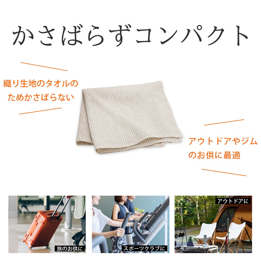 麻タオルは持ち運びにも便利なので、ご自宅でももちろん、旅行用タオルやジムタオル、キャンプなどのアウトドアシーンでも活躍します。
