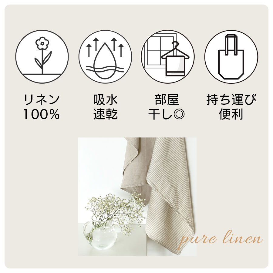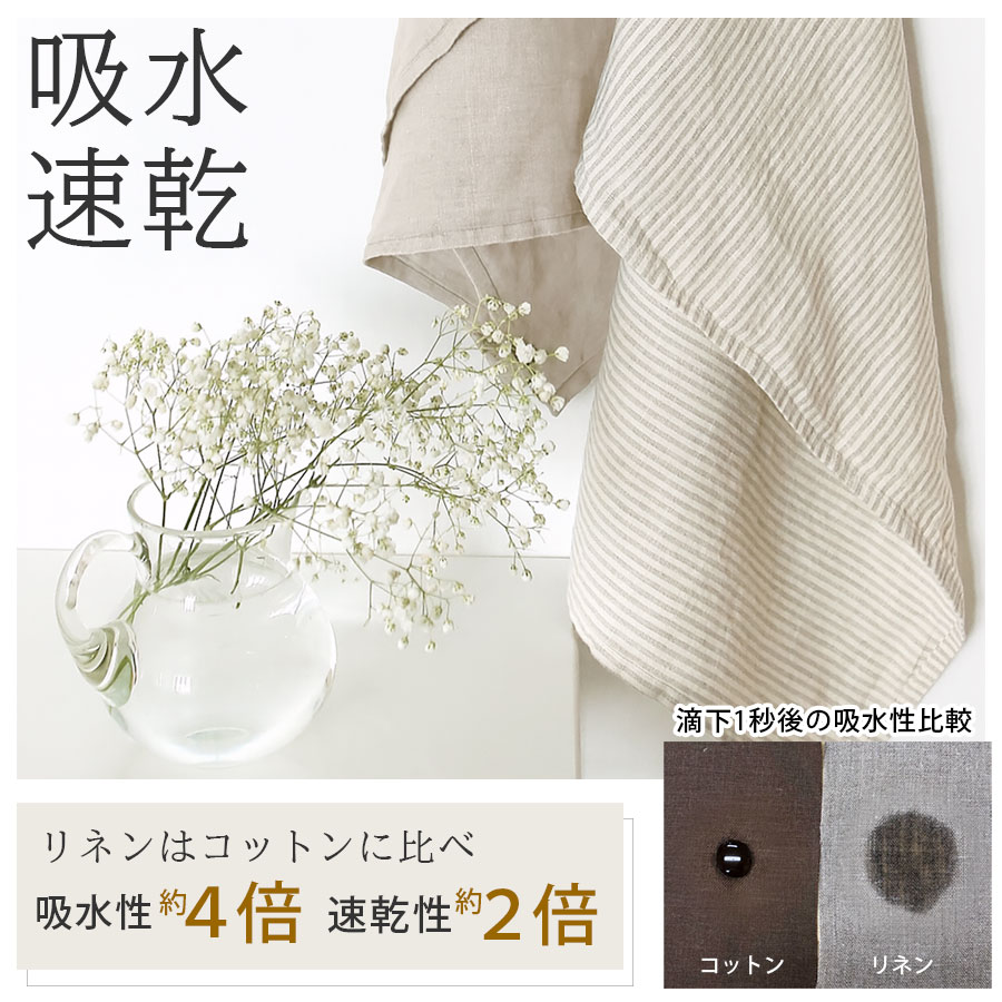 吸水性約4倍・速乾性約2倍※と言われる天然素材リネンを100%使用した高品質バスタオルです。さらっとした肌触りで水分を素早く吸収し、乾きも早いため毎日快適に使えます。使い込むほどに柔らかく、肌なじみが良くなります。