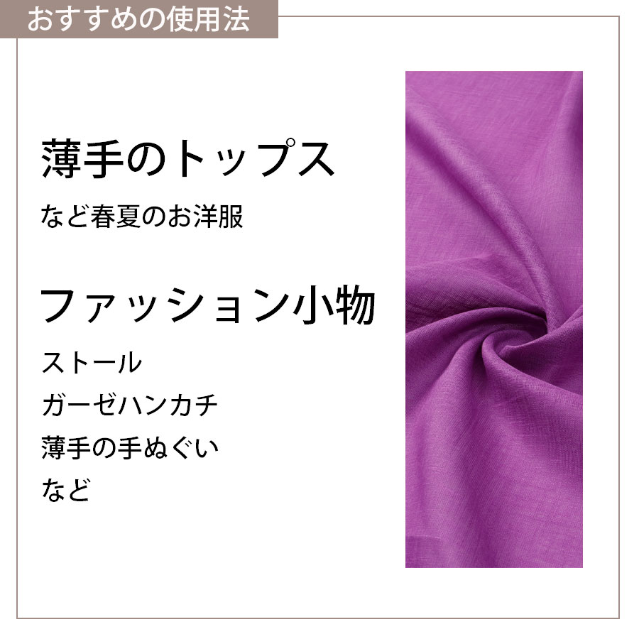 上質な麻ならではのさらりとした肌ざわりと、透け感をお楽しみいただけます。通気性が高く、春夏シーズンにぴったりの素材です。洗い込むほどに柔らかく、肌に優しい質感に変化していきます。